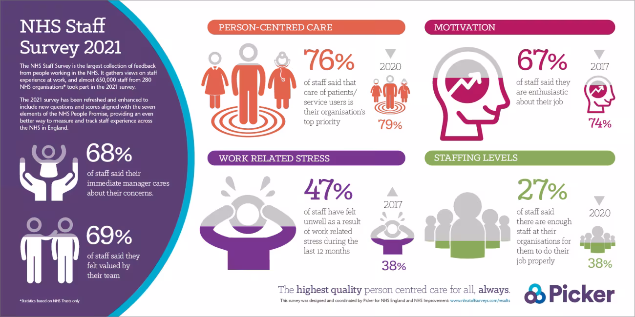 The NHS Staff Survey is now the largest workforce survey in the world and it provides detailed insight into the experiences of staff working in a wide range of NHS organisations and professions. Almost 650,000 staff from over 280 NHS organisations, including all 217 trusts in England took part in the 2021 survey. For the first time, in 2021 the survey questions were aligned with the NHS People Promise, which sets out in the words of NHS staff the things that would most improve their working experience. The survey was conducted from October to November 2021.